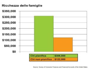 Come si può vedere nella immagine sopra, un’analisi condotta negli Stati Uniti sul risparmio delle famiglie ha rilevato che la ricchezza delle famiglie che pianificano è sensibilmente più grande di quella di coloro che non pianificano.