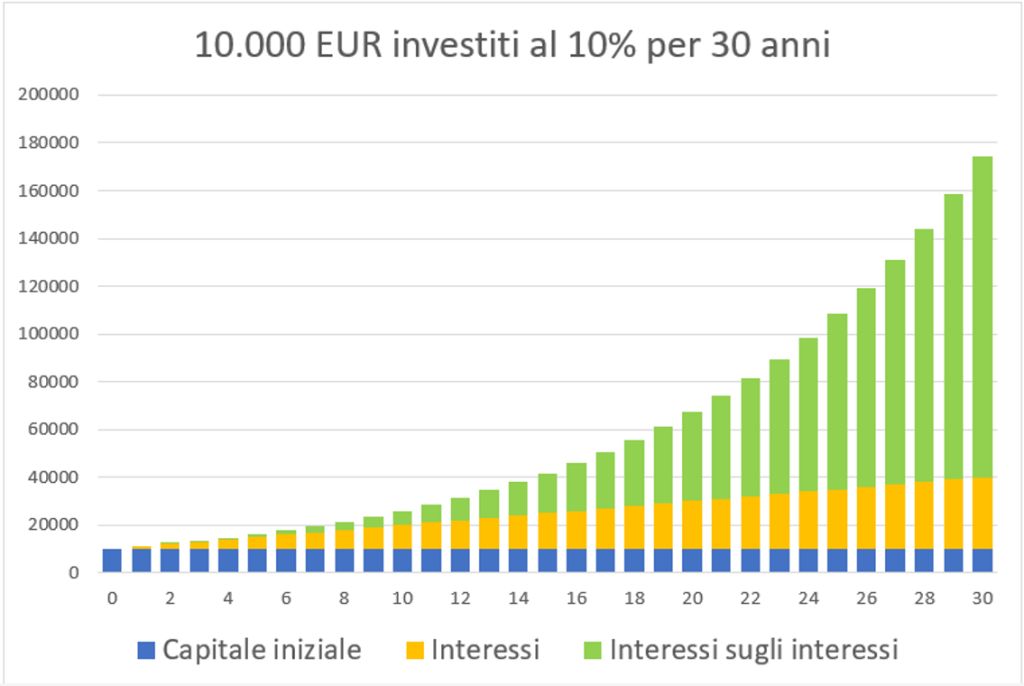 L’interesse composto è l’accumulo di interessi sul capitale investito e su tutti gli interessi maturati nel tempo: in pratica, fai lavorare i tuoi soldi al posto tuo.