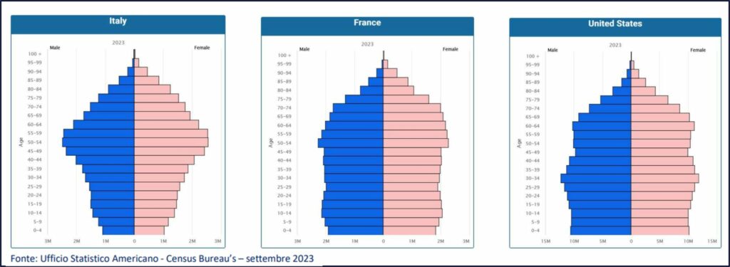 I grafici sopra, che rappresentano la distribuzione della popolazione per sesso e classi di età e mettono a confronto Italia, Francia e Stati Uniti mostrano chiaramente che il declino demografico è prettamente un problema del nostro Paese.